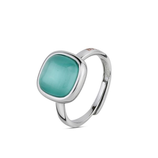 Anello donna in bronzo rodiato con pietra sfaccettata di color azzurro lattiginoso. Misura regolabile.