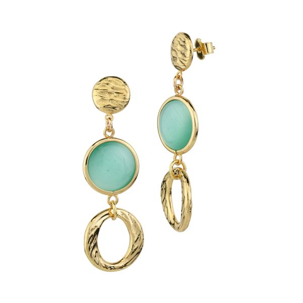 Orecchini pendenti in bronzo placcati oro giallo con con cristalli di colore verde acqua e moduli circolari martellati. Chiusura a farfallina.