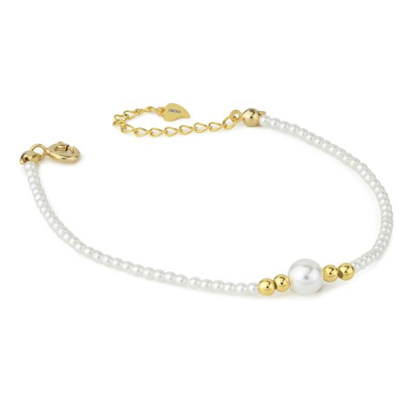 Bracciale in argento925 placcato oro giallo e perle. Lunghezza regolabile tramite moschettone.