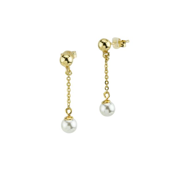Orecchini donna pendenti in argento 925 placcati oro giallo e perle bianche. Chiusura a farfallina.