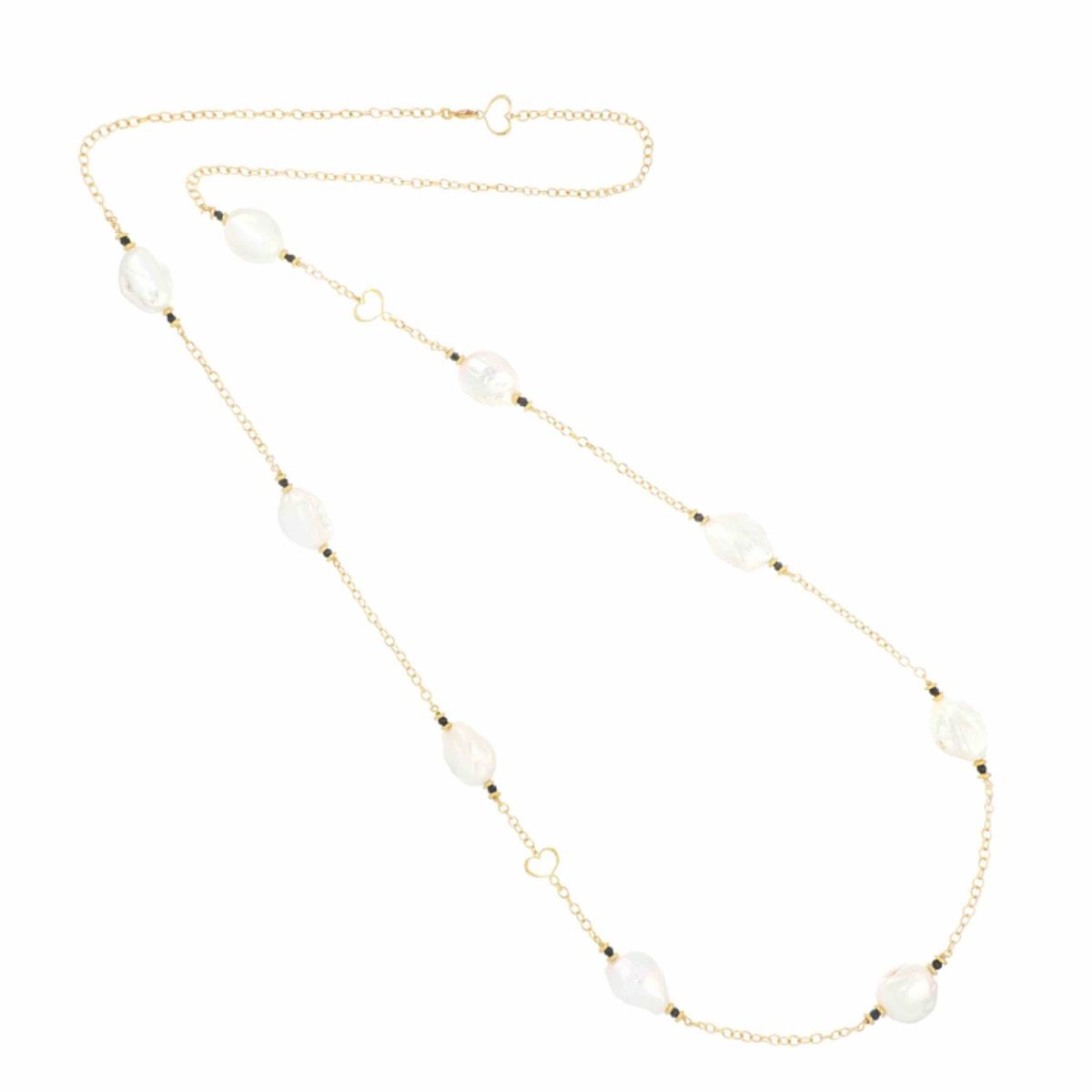 Collana lunga ClPES9CT realizzato in argento 925 con galvanica oro giallo ad alto spessore e ad alta resistenza con perle scaramazze naturali irregolari alternate a catena e cuori maman. Ogni perla presenta due pietre laterali di spinello nero sfaccettato di 2,5 mm.