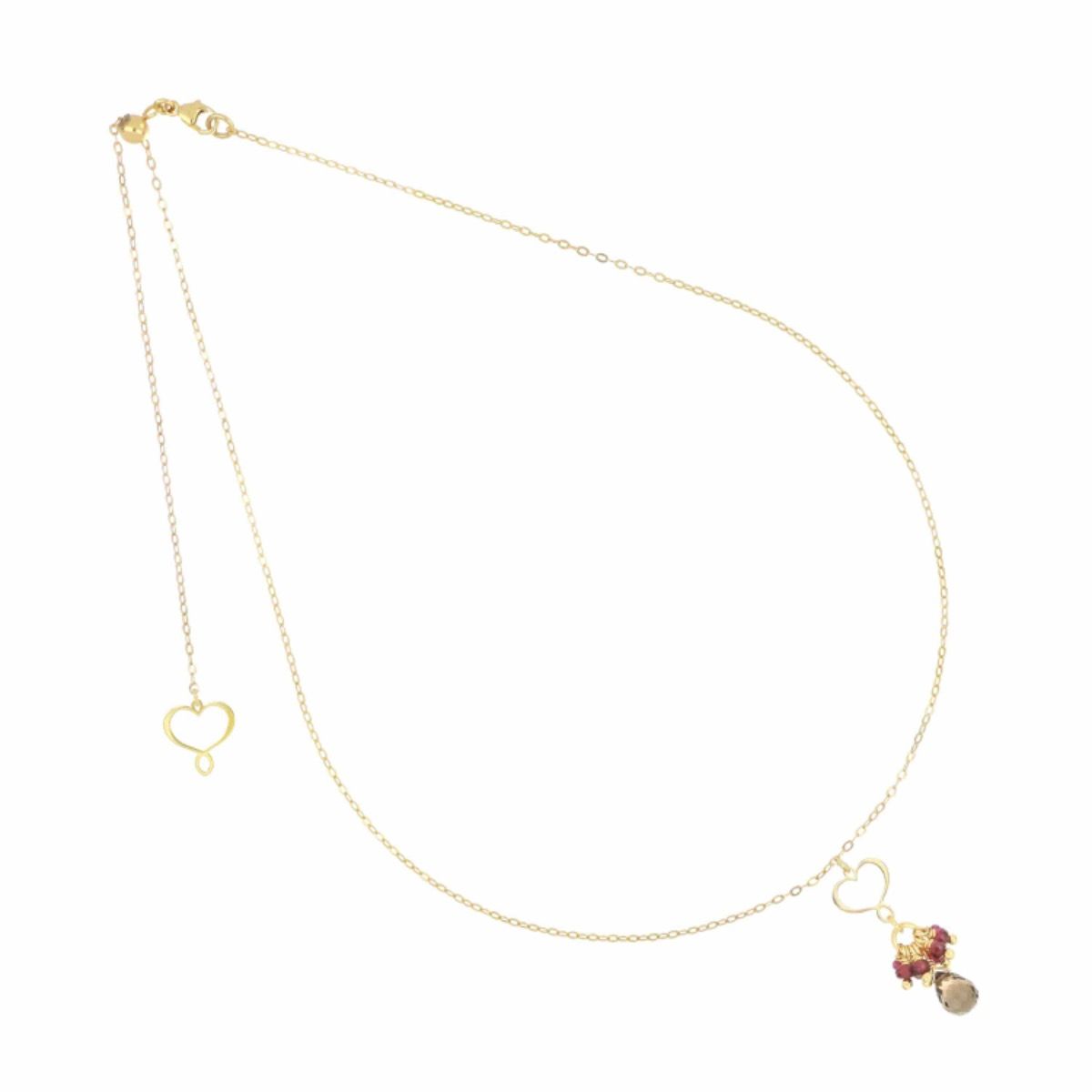Girocollo chocker GHFRAMSGR1QF realizzato in argento 925 con galvanica oro giallo ad alto spessore e ad alta resistenza. Presenta cuore Maman, pietre di rubino e granato e una goccia di quarzo fumè pendente. Il girocollo può essere regolato fino ad un massimo di 44 cm grazie alla piccola sfera scorrevole. È presente il cuore Maman traforato all’estremità.
