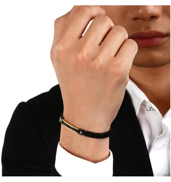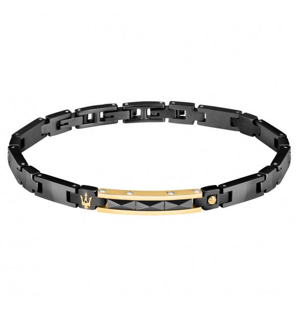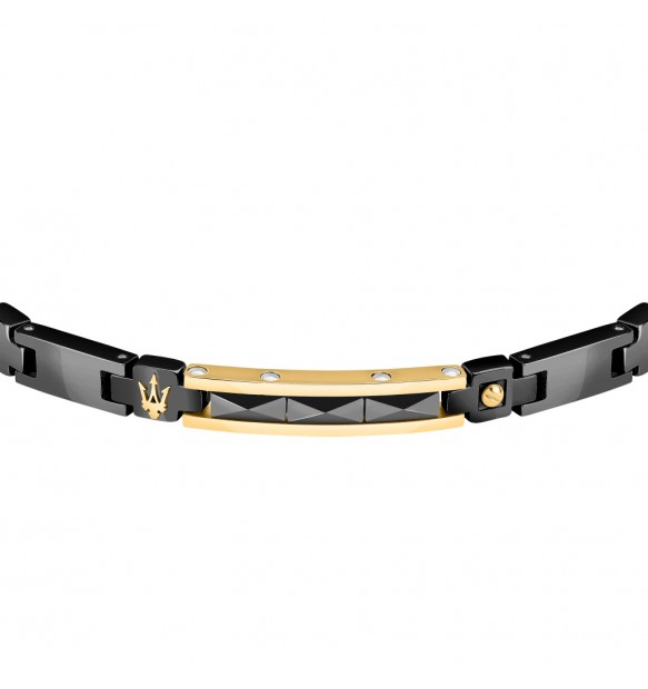 Bracciale uomo in acciaio 316L anallergico con trattamento ip nero. Centrale con finitura dorata, logo laterale e inserti in ceramica nera. Lunghezza regolabile tramite settori predisposti.