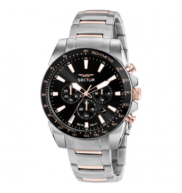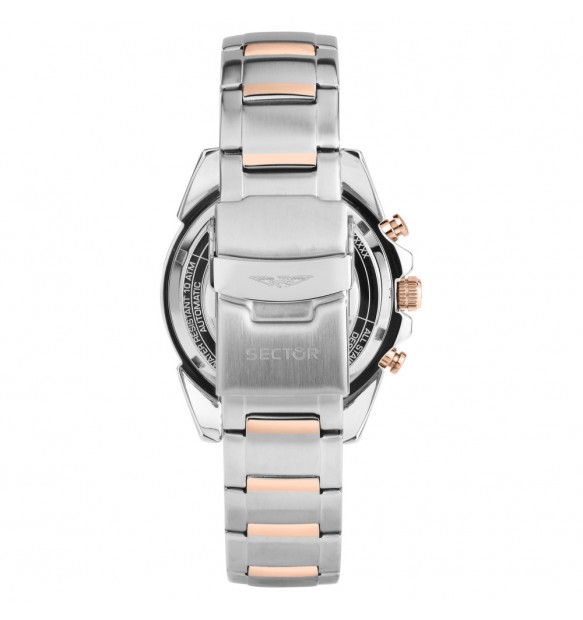 Cinturino bicolore in acciaio anallergico silver e rose gold; chiusura deployante con pulsanti. Resistente all’acqua fino a 100 metri di profondità.