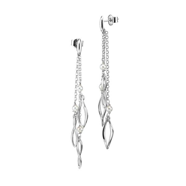 Orecchini in bronzo rodiato con tre fili pendente e perle. Chiusura a farfallina.