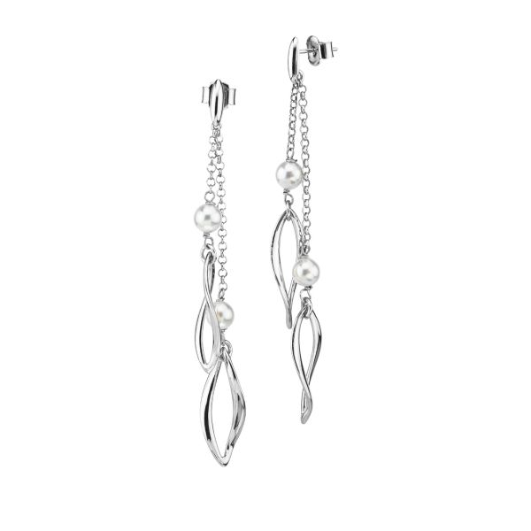 Orecchini in bronzo rodiato con due fili pendenti e perle. Chiusura a farfallina.